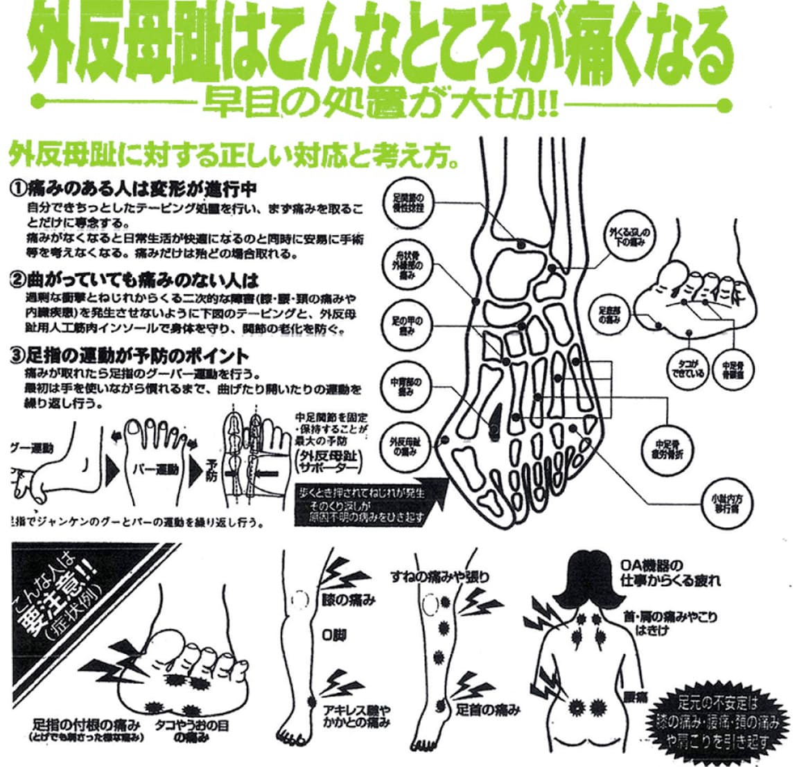 足の裏にタコや魚の目ができたり親指小指でバランスを取る為歪になり右側に負担がかかった時は左側でバランスを取ろうとして痛みが足元のバランスの崩れで下の方から上の方に足首・膝・腰・肩・首と進む状態を外反母趾と言います。
